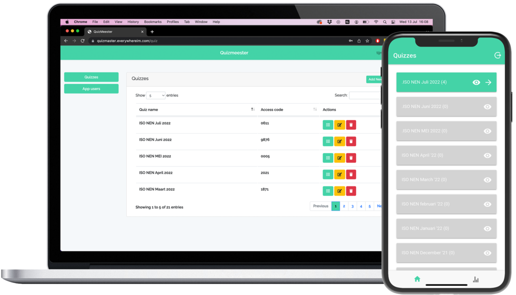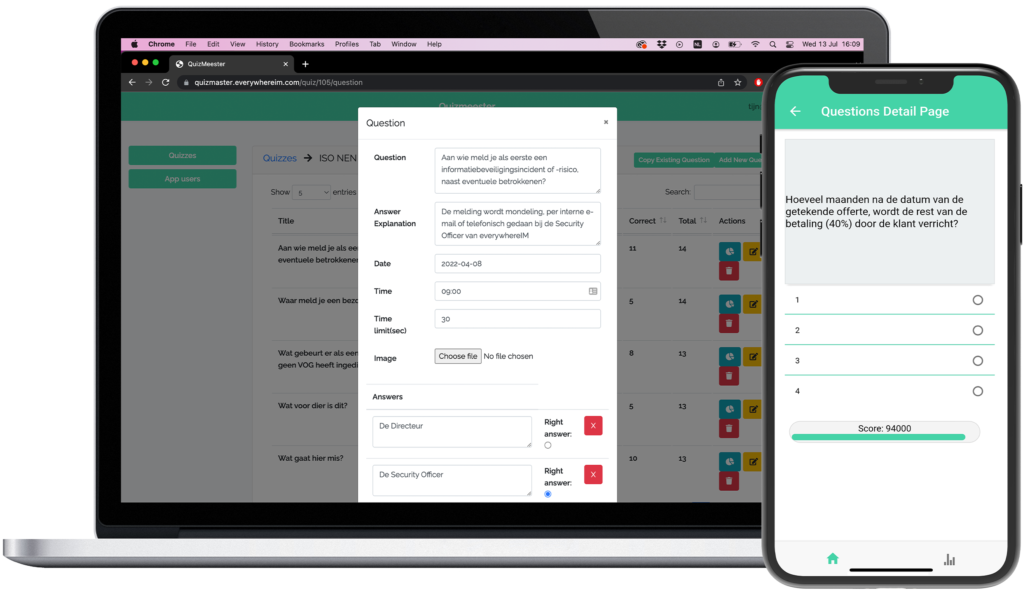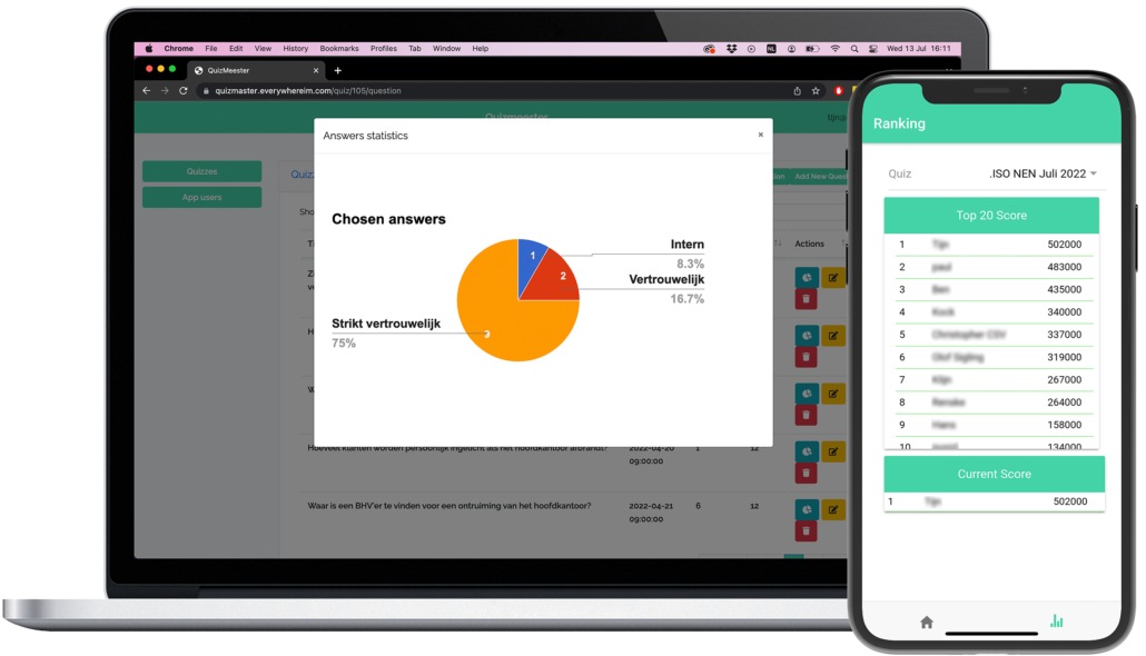Via het CMS worden quizzes aangemaakt en verzonden naar de juiste doelgroep. De participanten ontvangen hun vragen via de app en er is tevens een leaderboard om te zien wie er aan de leiding gaat. Quizmeester is bij uitstek geschikt om interne kennis te toetsen, maar ook om bijvoorbeeld jouw collega’s beter te leren kennen.
